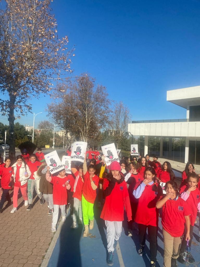 Young girls, university students in Malatya Turkey, walking and running for WHISTLE. The girls marched against verbal abuse in sports, chanting various slogans and whistling,